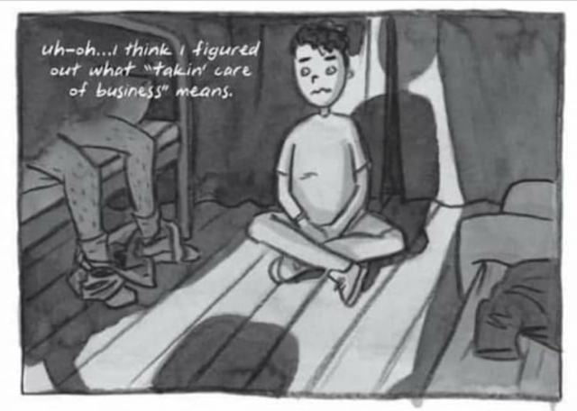 The boy, a fictional 14 year old Boy Scout, also learns that "taking care of business" means masturbating, when he sees another boy sitting on a cot in the tent, with his pants down around his ankles.